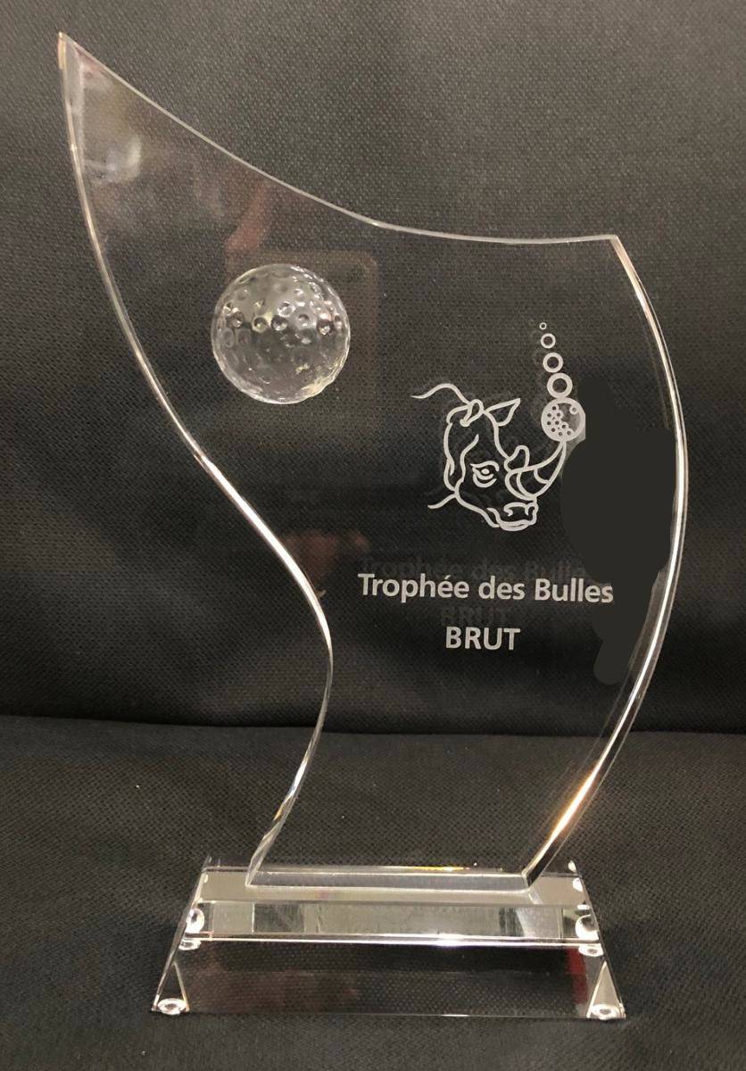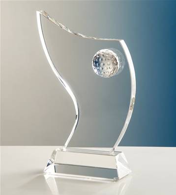 Trophée avec demi balle de golf en verre collée sur le fronton