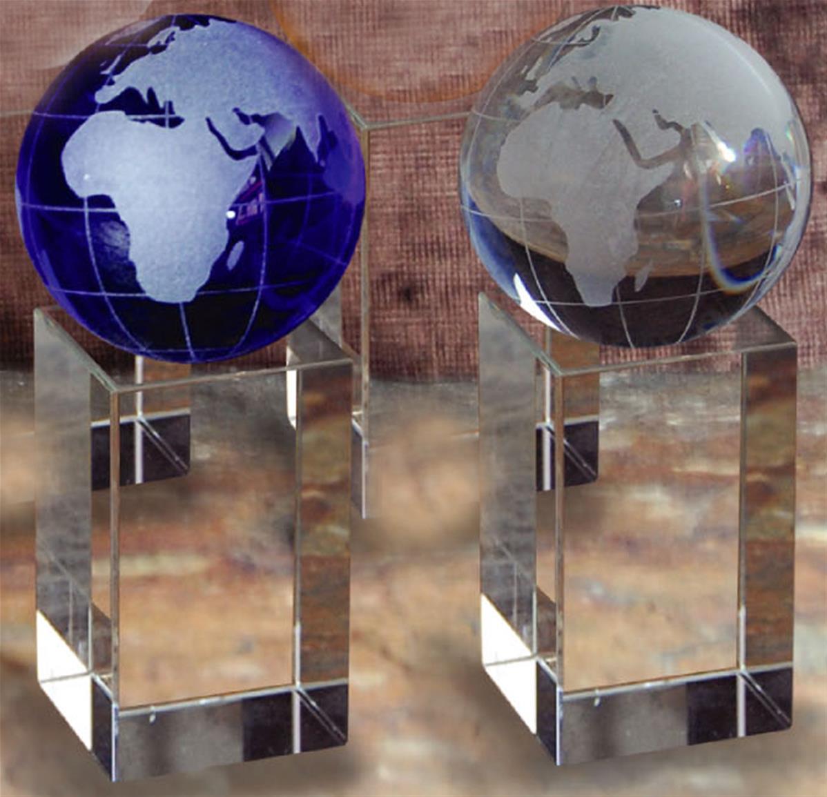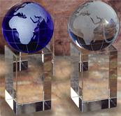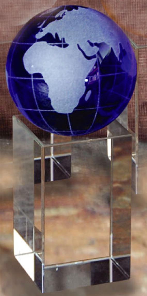 Trophée avec Mappemonde bleue en verre Ø: 5 cm fixée sur un socle en verre