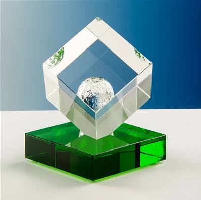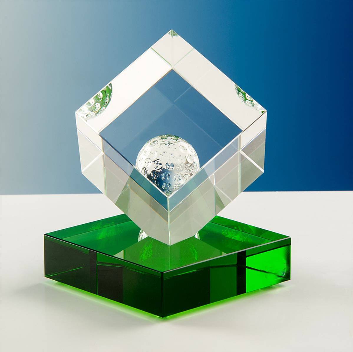 - Balle de golf en verre clair située derrière un cube en verre pour un effet relief inédit !