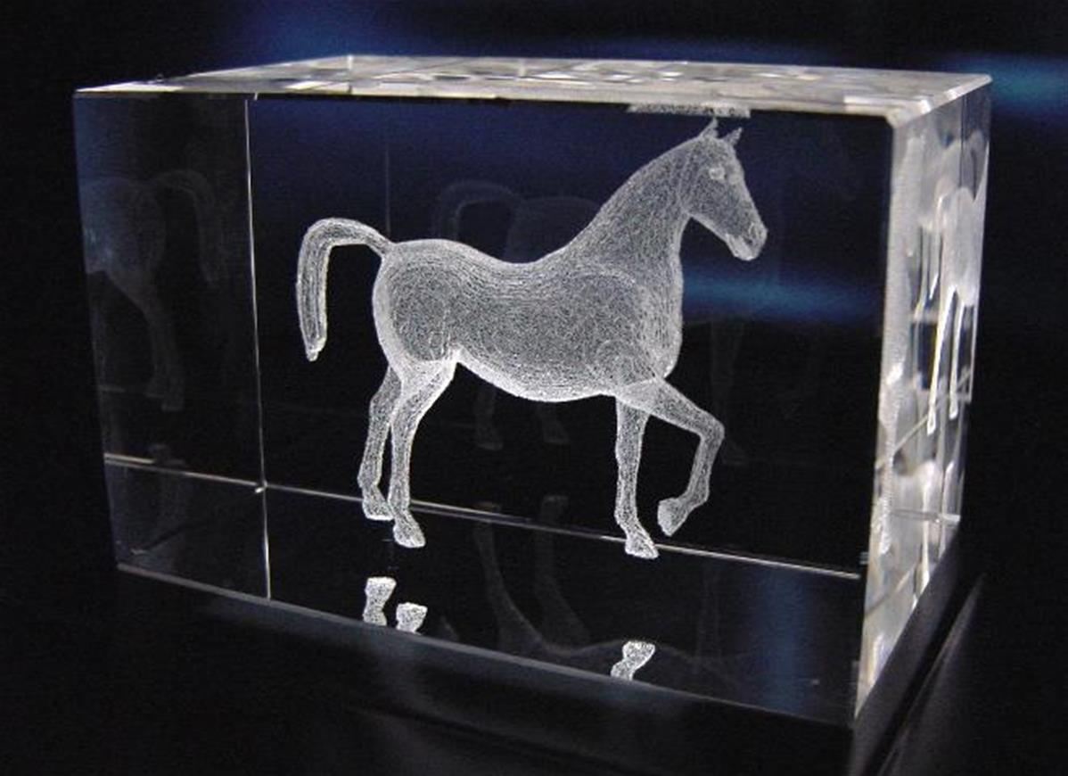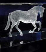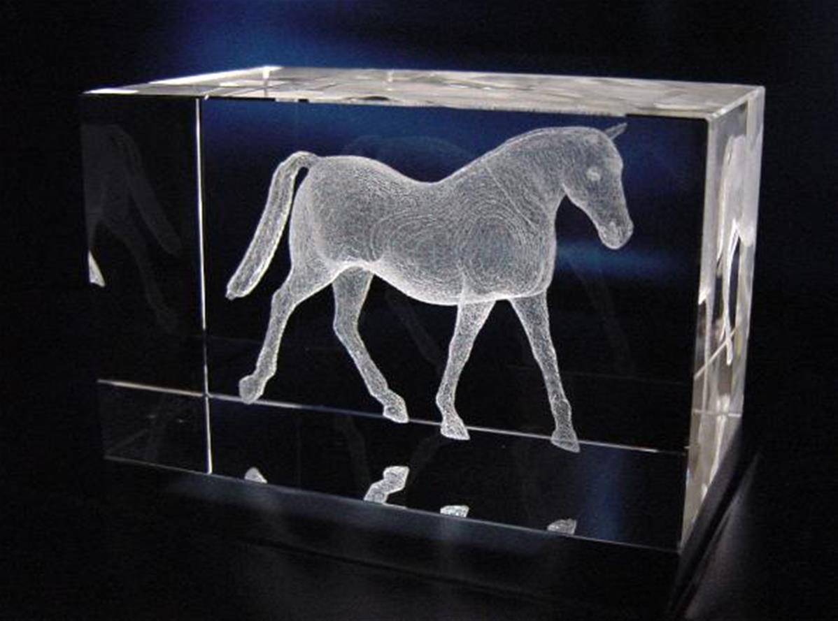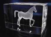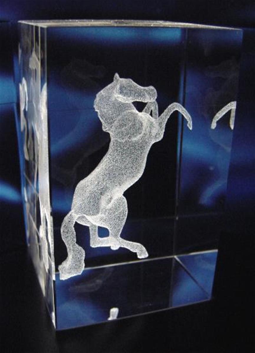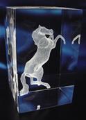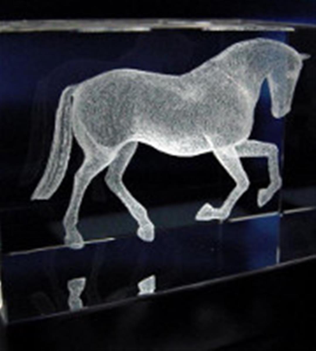 Bloc en verre avec gravure en 3 Dimensions d'un cheval à l'intérieur du trophée.