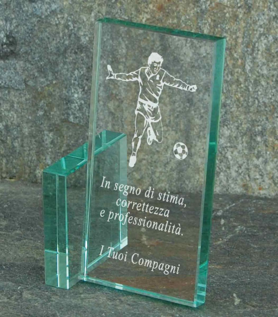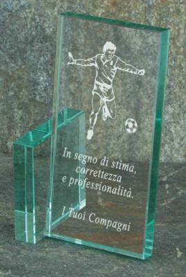 • Footballeur réalisé en gravure en sablage positionné sur la partie haute du trophée
