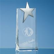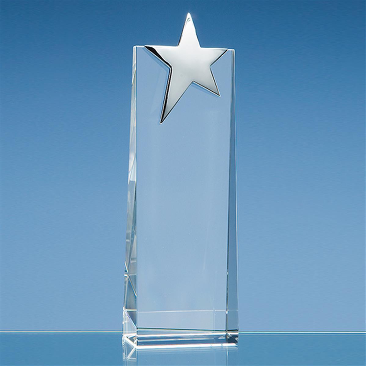 - Etoile argentée à 5 branches fixée sur un socle en verre haut de gamme